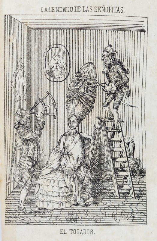 El tocador, litografía en Calendario de las señoritas megicanas, para el año bisiesto de 1840, portada, México, Imprenta de Mariano Galván, 1840. Biblioteca Ernesto de la Torre Villar – Instituto Mora.