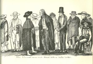 En la misma tarde calurosa subían por la calle de la Aduana, que ahora se conoce como de la Aduana Vieja, varios muchachos, empujándose y bromeando entre sí con toda la alegría de la edad, encaminados hacia el mismo local. Bien mirado, ya no estaban tan jóvenes como para alborotar tanto, andaban por los 17 años de edad desbordando energía. El más alegre de ellos, Melchorito Barreda y Nurieta, traía bajo el brazo un atado de figurines que había estado hojeando esos últimos días, para ajustarse a los dictados de la última moda que llegaba de Francia. Los dos grupos entraron casi al mismo tiempo al espacioso taller, en donde el personal tuvo la atención de recibirlos y rogarles un momento de espera. Por un lado, los muchachos, ante espejos muy grandes que enmarcaban su as- pecto juvenil (uno de estos espejos puede aún admirarse en la dulcería El Lirio, de la calle de Santa Clara), y en otra sala, los jueces y demás empleados de los juzgados, a quienes también, se les rogó esperar. La colección de figurines parisinos pasaba de mano en mano entre los amigos de Melchor, todos ellos vecinos de la traza española de la Puebla, que soñaban con lucir el pantalón de estribos, chaleco de terciopelo afelpado, de cuadros o de sedas de aguas con botón de seda, un poquito más largos de lo acostumbrado. Los grabados mostraban pantalones de casimir de cuadros, de medios colores, con pialera y más bien anchos; corbatas de chal de colores oscuros salpicadas de blanco, con nudo a la negligée y un pequeño prendedor; y para rematar, sombreros negros de ala ancha y copa alta, terminan- do el atuendo con un bastón delgado con cabecita de marfil, guante blanco,