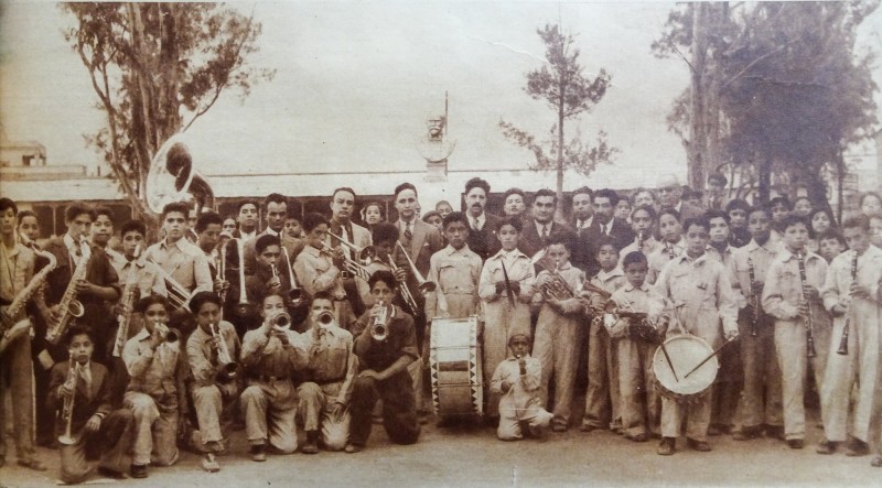Banda de música de los alumnos de la Escuela Francisco I. Madero con su director José Ávila Garibay, el secretario de Educación Pública, José Ángel Ceniceros, el secretario de Gobernación Ignacio García Tellez y el expresidente Emilio Portes Gil, entre otros, fotografía en El Nacional, 16 de agosto de 1936. Colección particular.